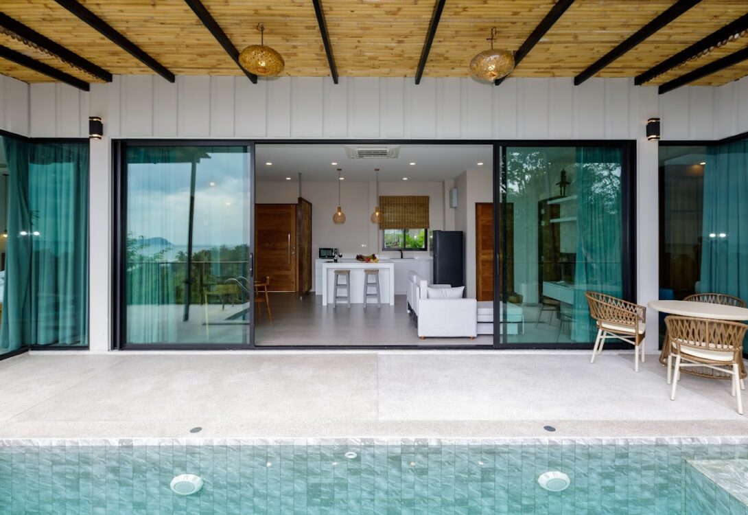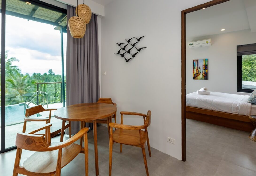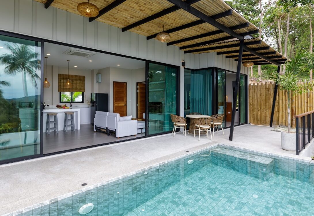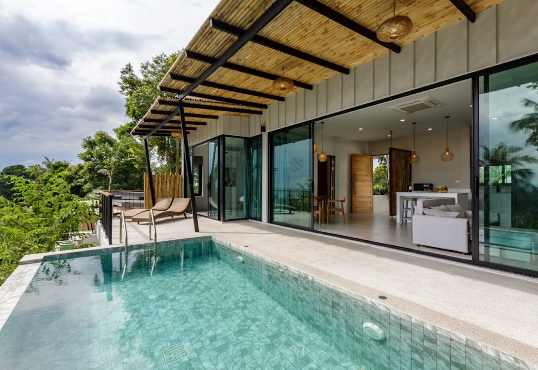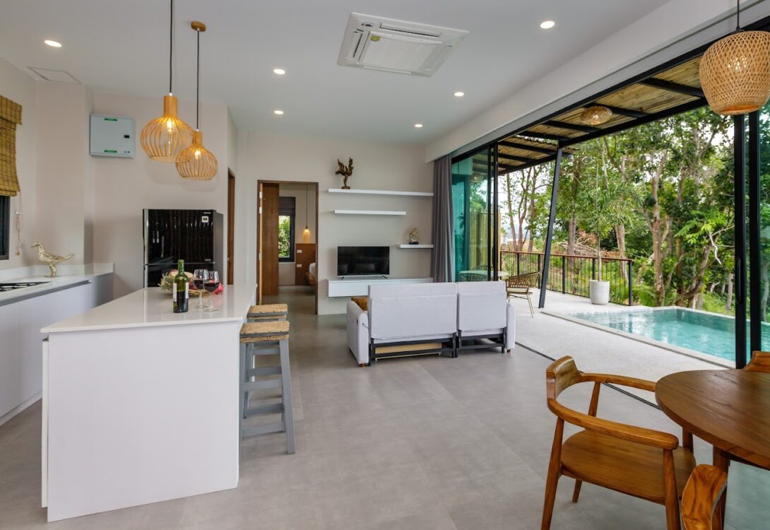 HinKong Views Pool Villa A – a 2-bedroom modern villa with an infinity pool overlooking the Bay of Hin Kong. Thoughtfully designed interiors across 160 m² create a refined and peaceful stay on one of the most desired locations.