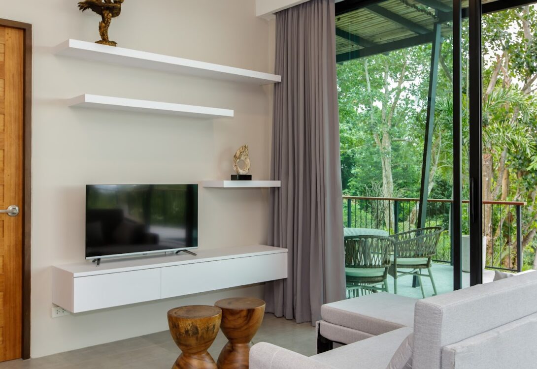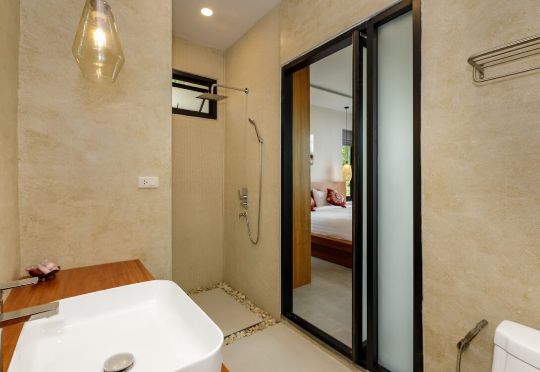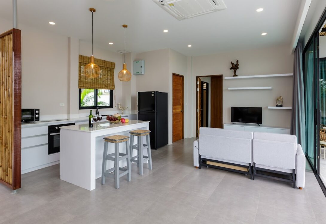 Both king-size bedrooms feature sea views and the fully equipped European kitchen makes cooking effortless. The living area opens onto a shaded terrace and private infinity pool — a perfect place to relax and watch the sunset. Peaceful yet close to cafés, restaurants and yoga studios, this villa is an inviting retreat in one of Koh Phangan’s most desirable areas.