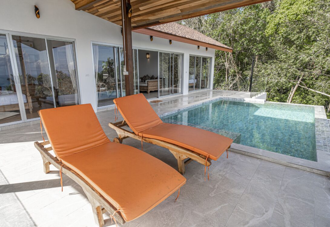 Two inviting bedrooms open toward the ocean, while the bright living area connects to wide terraces and a saltwater pool — perfect for unwinding, yoga, or sunset moments. Haad Salad Beach just minutes away, Santai 8 balances privacy, scenic beauty, and easy island living in one serene sanctuary.